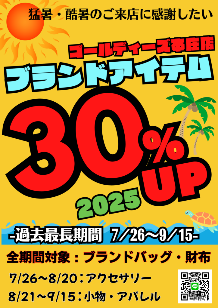 【終了】 ゴールディーズ本庄店、真夏のブランド30%UPキャンペーン開催!