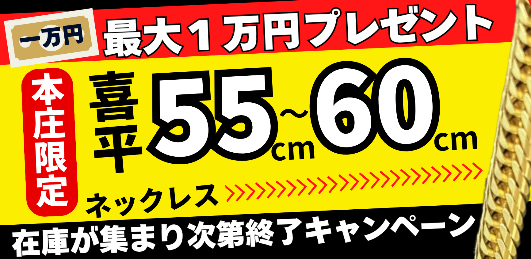 買取情報ゴールディーズ本庄店金・プラチナ ダイヤキャンペーン金・喜平埼玉県本庄市のゴールディーズ本庄店では、金相場高騰中の今、喜平ネックレス買取を強化中!55〜60cmの6面ダブル・12面・Mカットなど対象商品ご成約で最大1万円プレゼント!